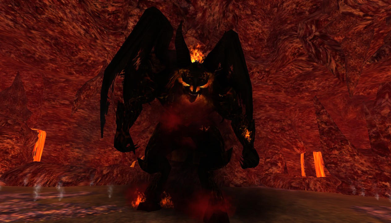 wreathed with fire; it has glowing red eyes and big teeth; it has just