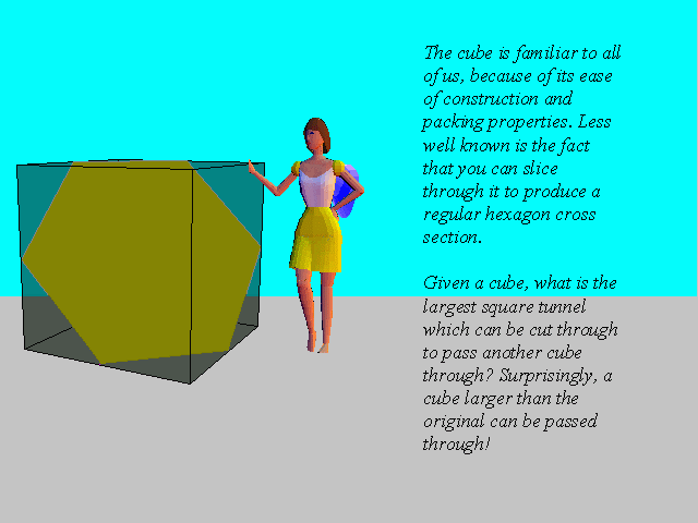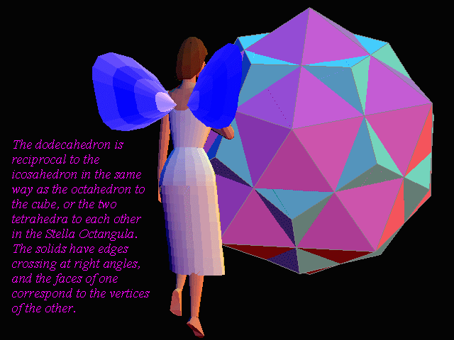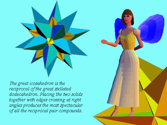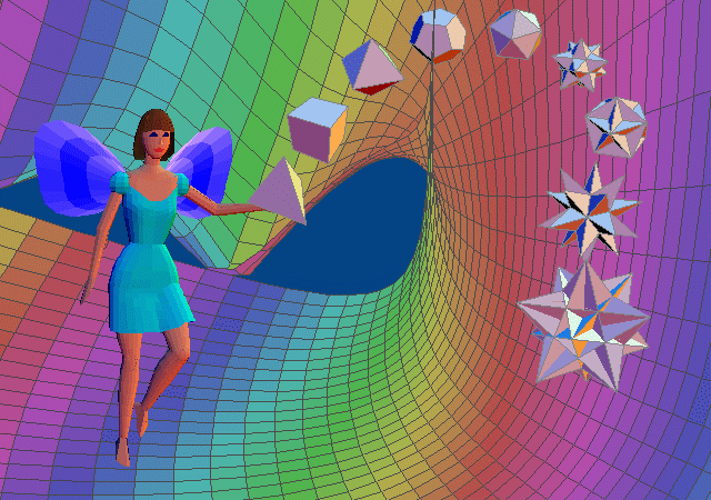 A polyhedron is regular if all its faces are equal regular polygons and all its vertices are alike. There are nine such polyhedra: five convex ones known to the Greeks, and four self intersecting ones discovered more recently. In this picture they are presented to us by Elliptica, who personifies the power and beauty of Mathematics. Elliptica herself is described parametrically by quite a few sines, cosines and exponentiations.