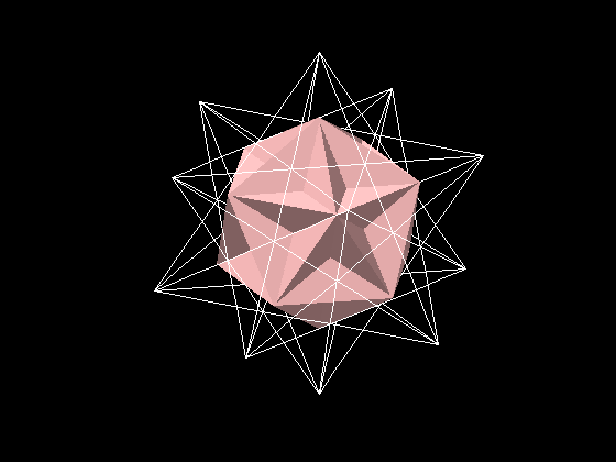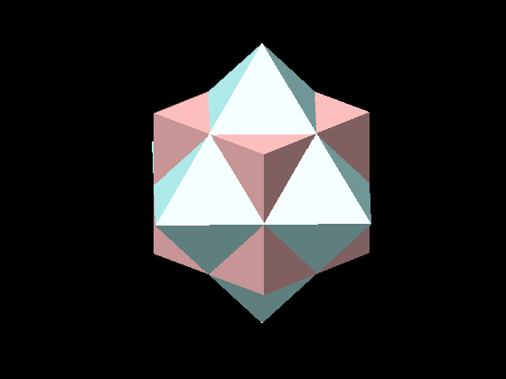 The Stella Octangula, or compound of two tetrahedra was named by Johannes Kepler. In this arrangement the two tetrahedra are reciprocal; the faces of one correspond to the vertices of the other and their edges cross at right angles. Many symmetries are apparent: the two tetrahedra have their vertices at the corners of a cube and their edges form the diagonals of the cube faces. Less obviously, the volume common to both of them is an octahedron. In fact, the two tetrahedra together can be thought of as a variety of octahedron; they have 8 triangular faces arranged symmetrically. |