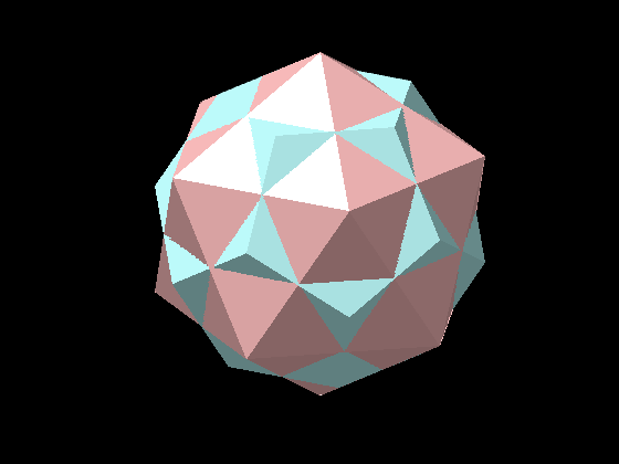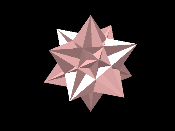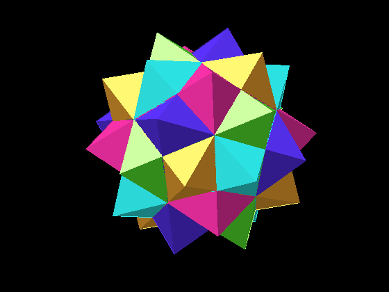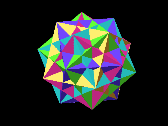 The compound of five octahedra is another variety of icosahedron, having 20 triangular faces; the interior common volume is an icosahedron. It is also reciprocal to the compound of five cubes. |