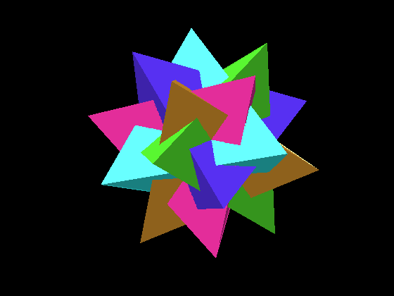 The compound of ten tetrahedra similarly arises from an icosahedron, which is the interior volume common to all of them: the ten tetrahedra between them have 20 triangular faces. They can also be seen as an arrangement of 5 Stella Octangulae, which suggests the compounds of five cubes and five octahedra below. |